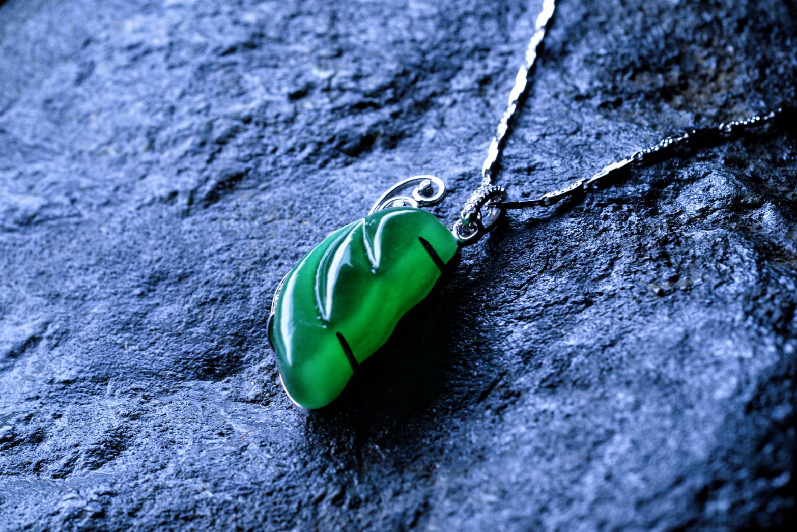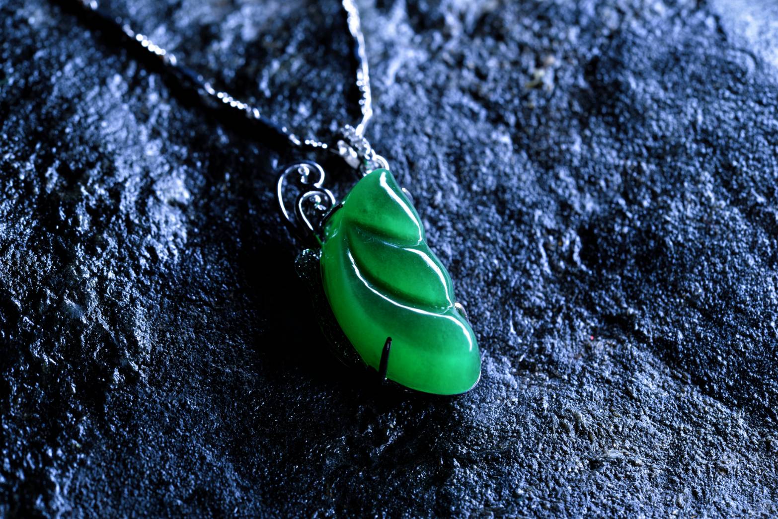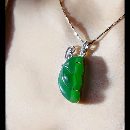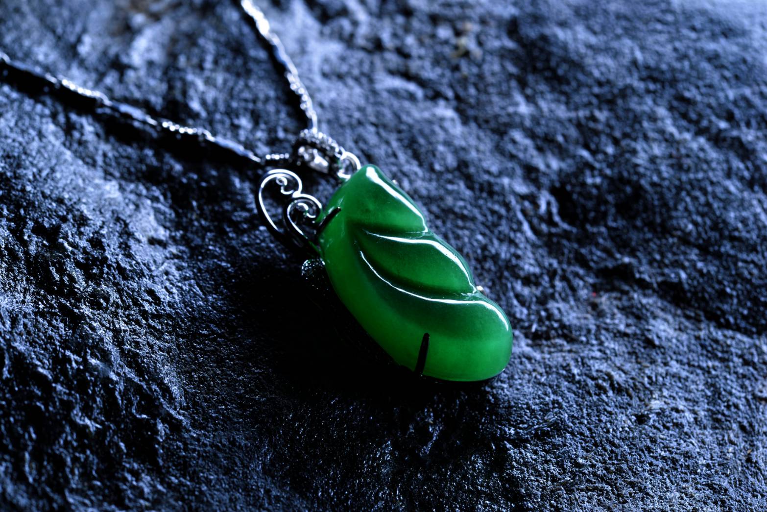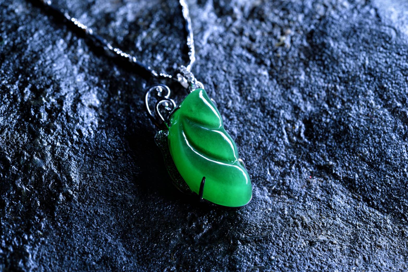 吊墜項鍊以一個充滿自然氣息且細節豐富的設計為特色。核心是一塊光滑、雕刻精美的鮮綠色翡翠,造型為一片葉子。這塊翡翠色澤濃郁、光澤良好,表面雕刻了仿真的葉脈紋理。