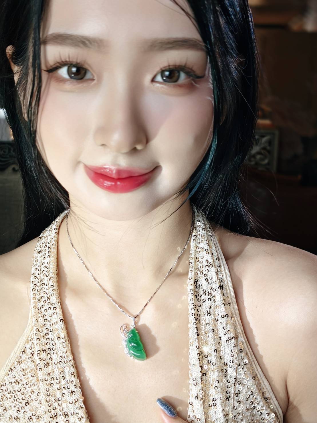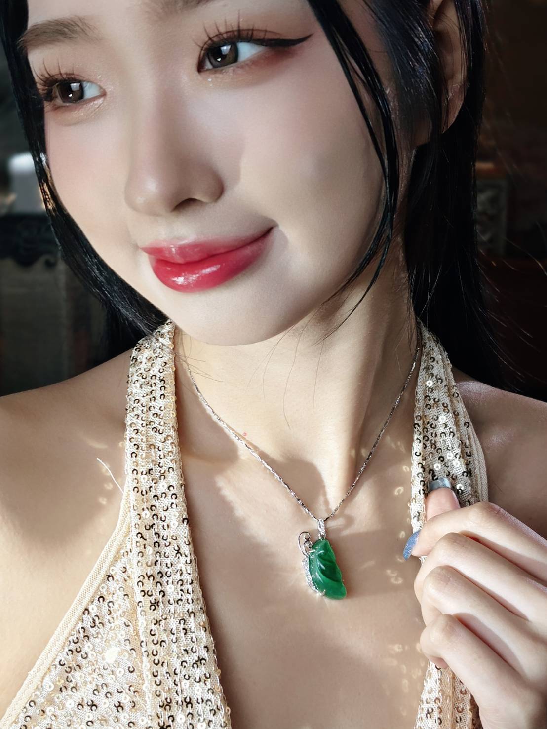 翡翠葉片的頂部由一個精緻的白色金屬鑲座穩固連接。吊環設計得非常考究,呈現出一個複雜的捲曲藤蔓或枝葉圖案,在捲曲處鑲嵌了一顆細小的璀璨點綴寶石,增添了微妙的閃光。吊墜懸掛在一條精細、色調較深的鏈條上。這件作品優雅地讚頌了大自然的寧靜,將優質翡翠的文化意義與精緻的有機珠寶藝術完美結合。