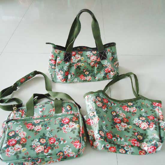 The displayed bags are made of PC for durability and sturdiness. They come with blossoming floral patterns on the green background that lure in onlookers’ attention easily. These PC handbags are easy to mix and match.