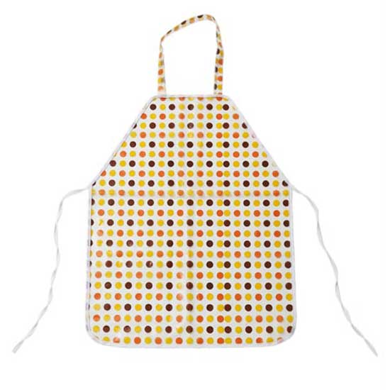 Pictured here is a stylish apron with dots in yellow, orange, and brown. The apron is made of safe and eco-friendly PEVA material. It is suitable to wear when cooking or cleaning.