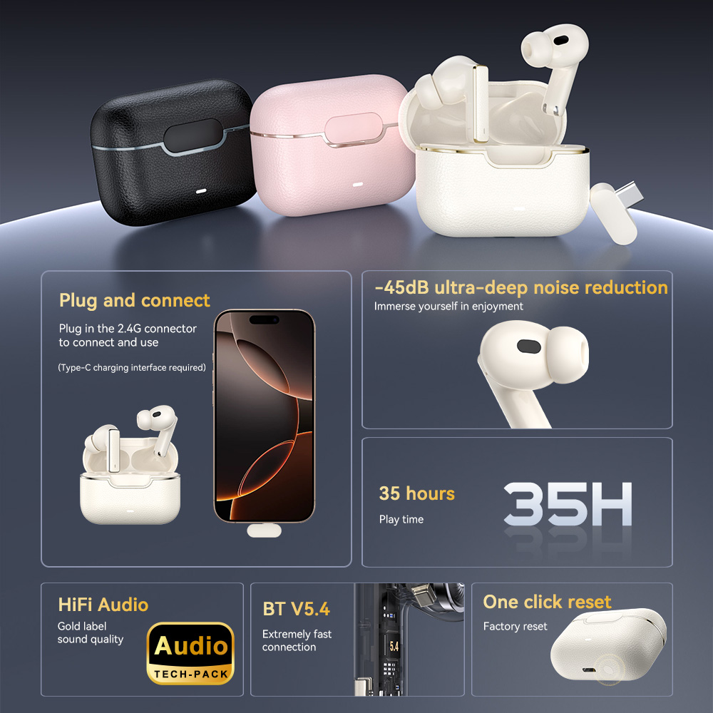 With More than 8 Years OEM ODM of Wireless Earphone, Featuring advanced noise Cancellation ,both wireless and 2.4G dongle 2 ways connectionS, Smart Optical Sensor in-ear detection, and Wireless Charging, this headphone delivers premium music quality, clear call & convenience. With multi-device connectivity, they seamlessly switch between smartphones, tablets,Ipad and etc. Designed for durability, it’s waterproof, comfortable, and offers long battery life. Perfect for importers, wholesalers, and brand owners in premium markets, these earbuds combine cutting-edge technology with sleek design. Elevate your audio game today!