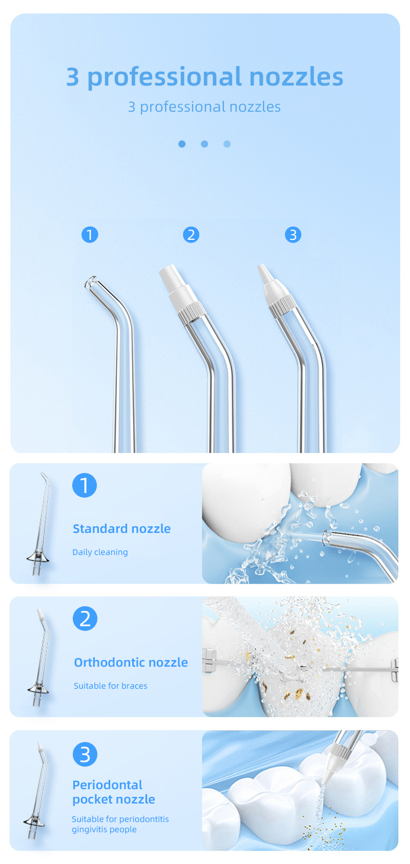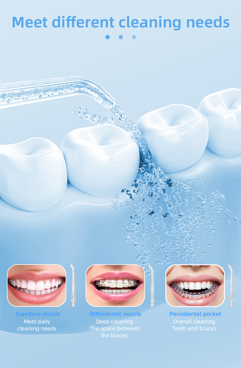 Comes with Standard, Orthodontic, and Periodontal Pocket nozzles. They respectively meet the needs of daily cleaning, brace cleaning, and deep periodontal care, catering to different oral conditions.