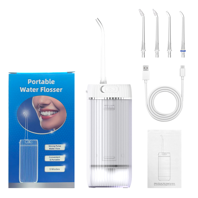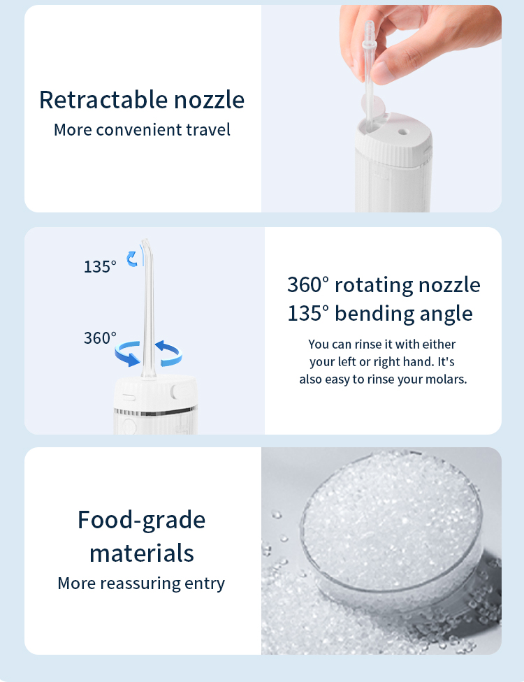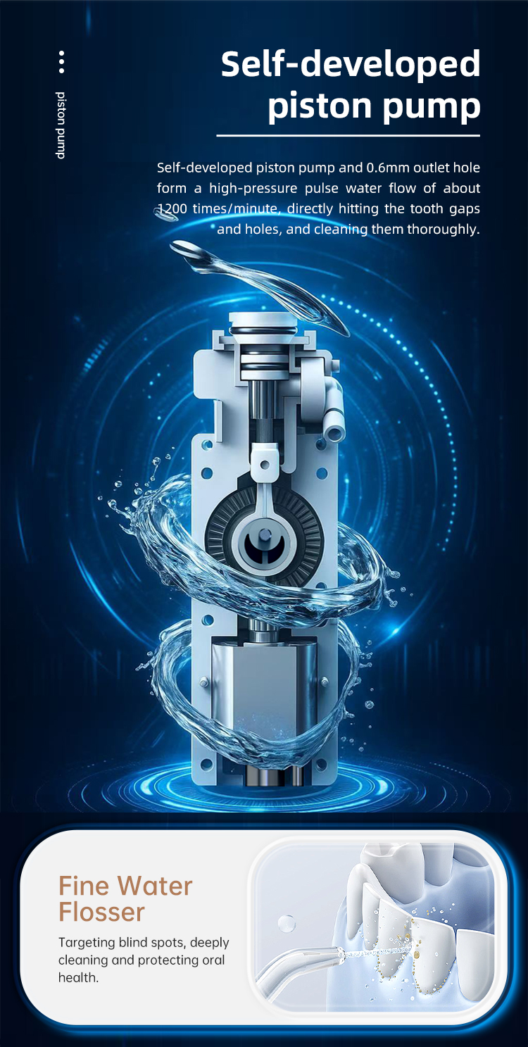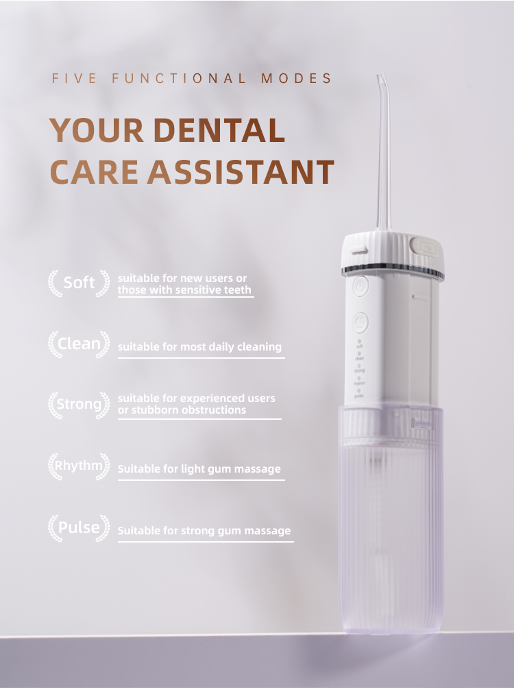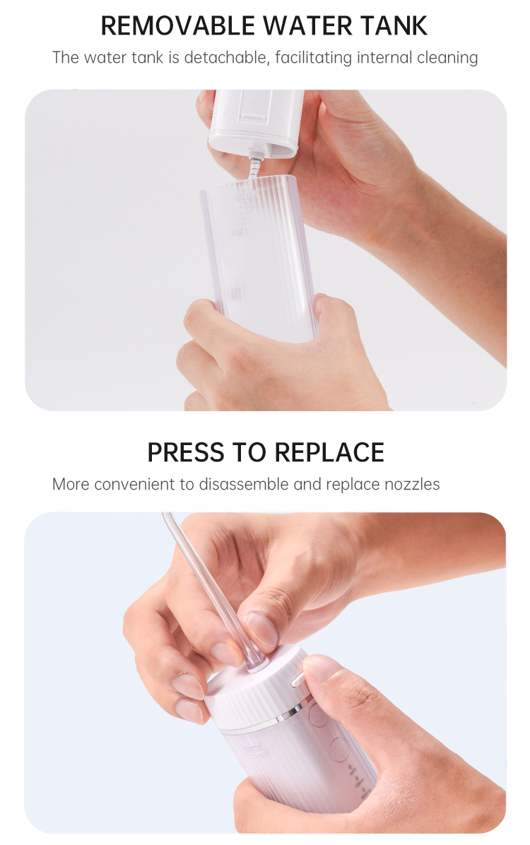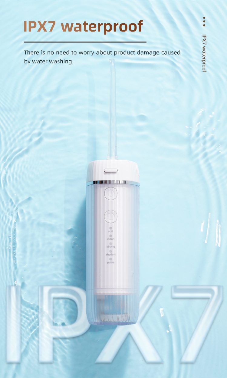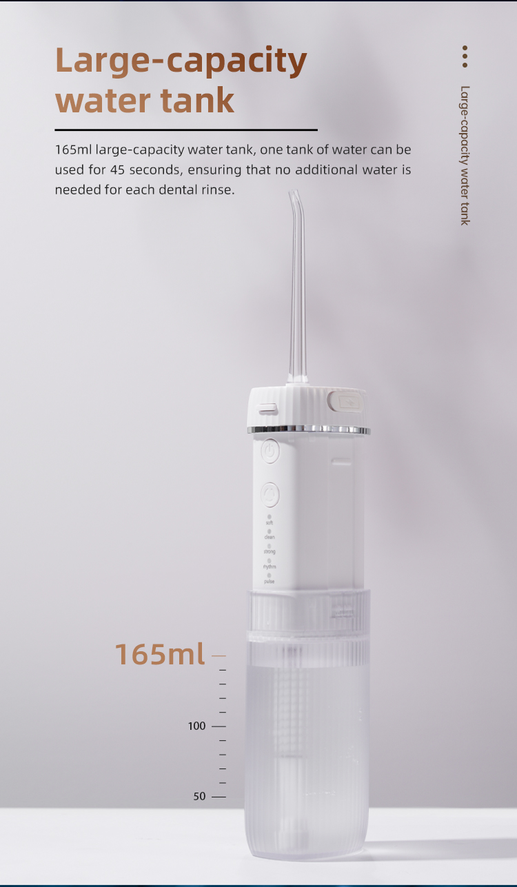 A portable oral irrigator with self-developed piston pump, 5 cleaning modes and IPX7 waterproof rating. The telescopic design is compact and space-saving, paired with a 165ml detachable water tank and long-lasting battery, suitable for daily cleaning, orthodontic care and periodontal treatment. It’s an essential oral care tool for home and travel.