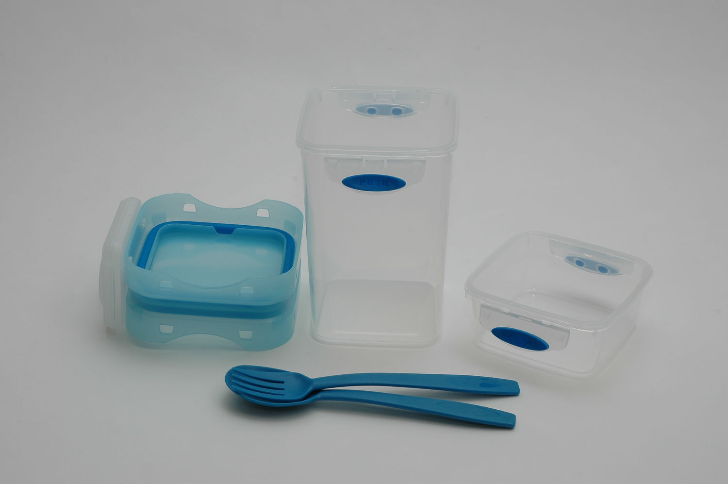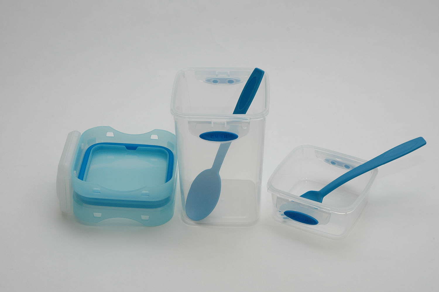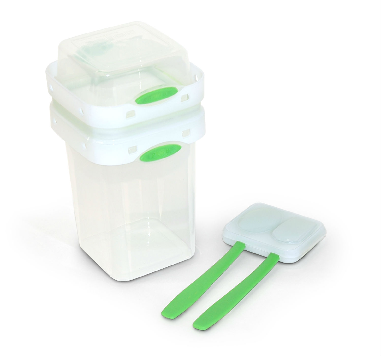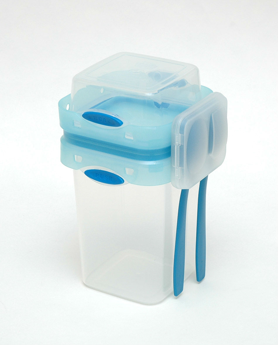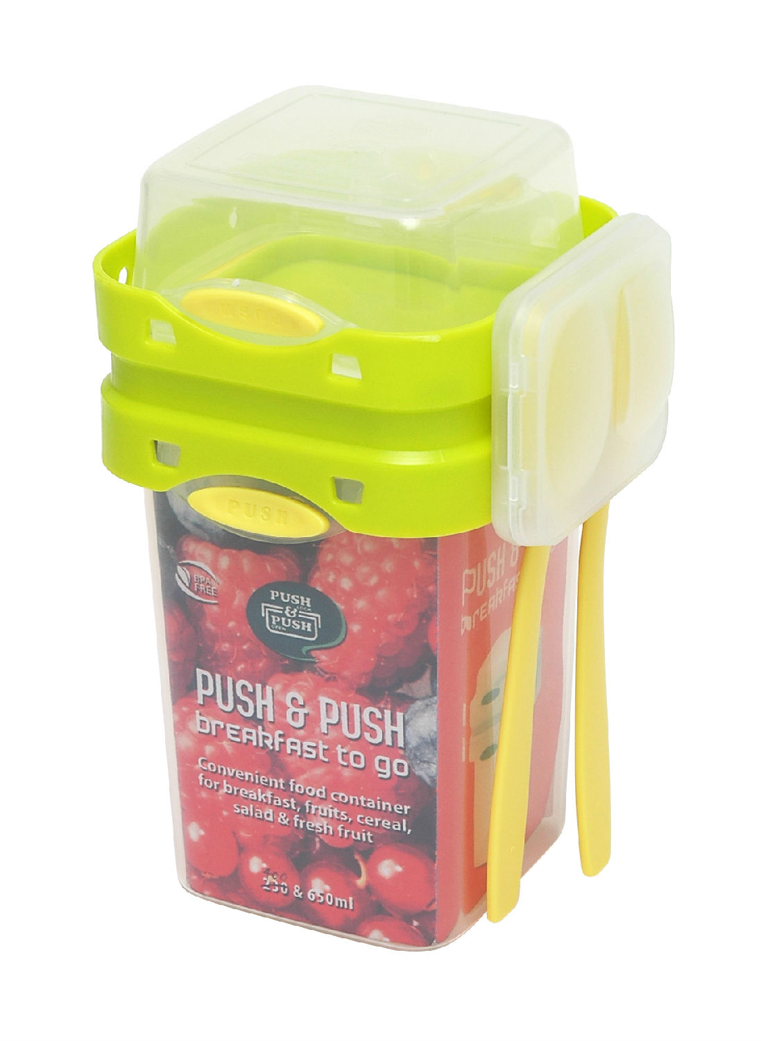 This set of two food containers have capacities of 230ml and 650ml respectively and has a lid in the middle. The food containers have translucent bodies for viewing stored contents and provides hygienic and mess-free storage for food. Included with the food container set is a fork and a spoon for eating food on the go.