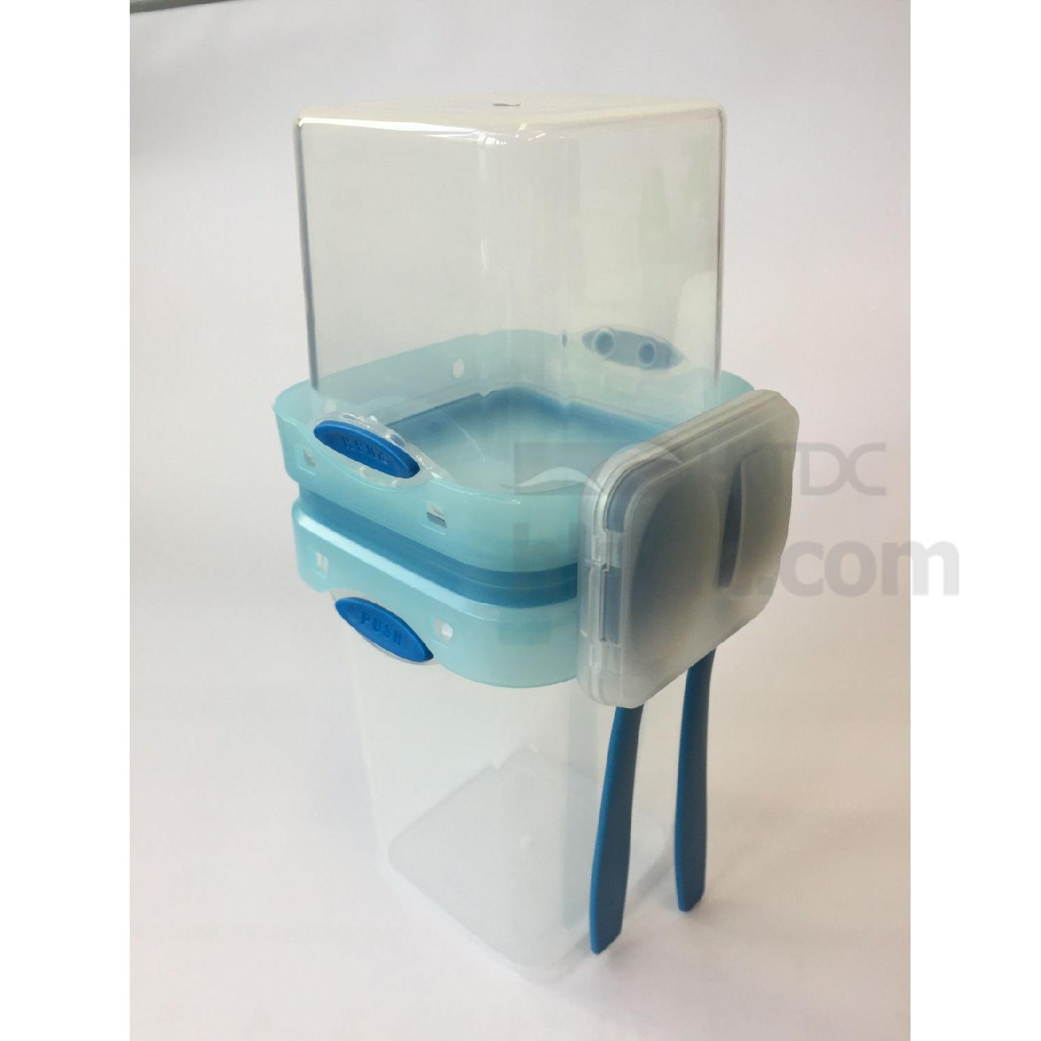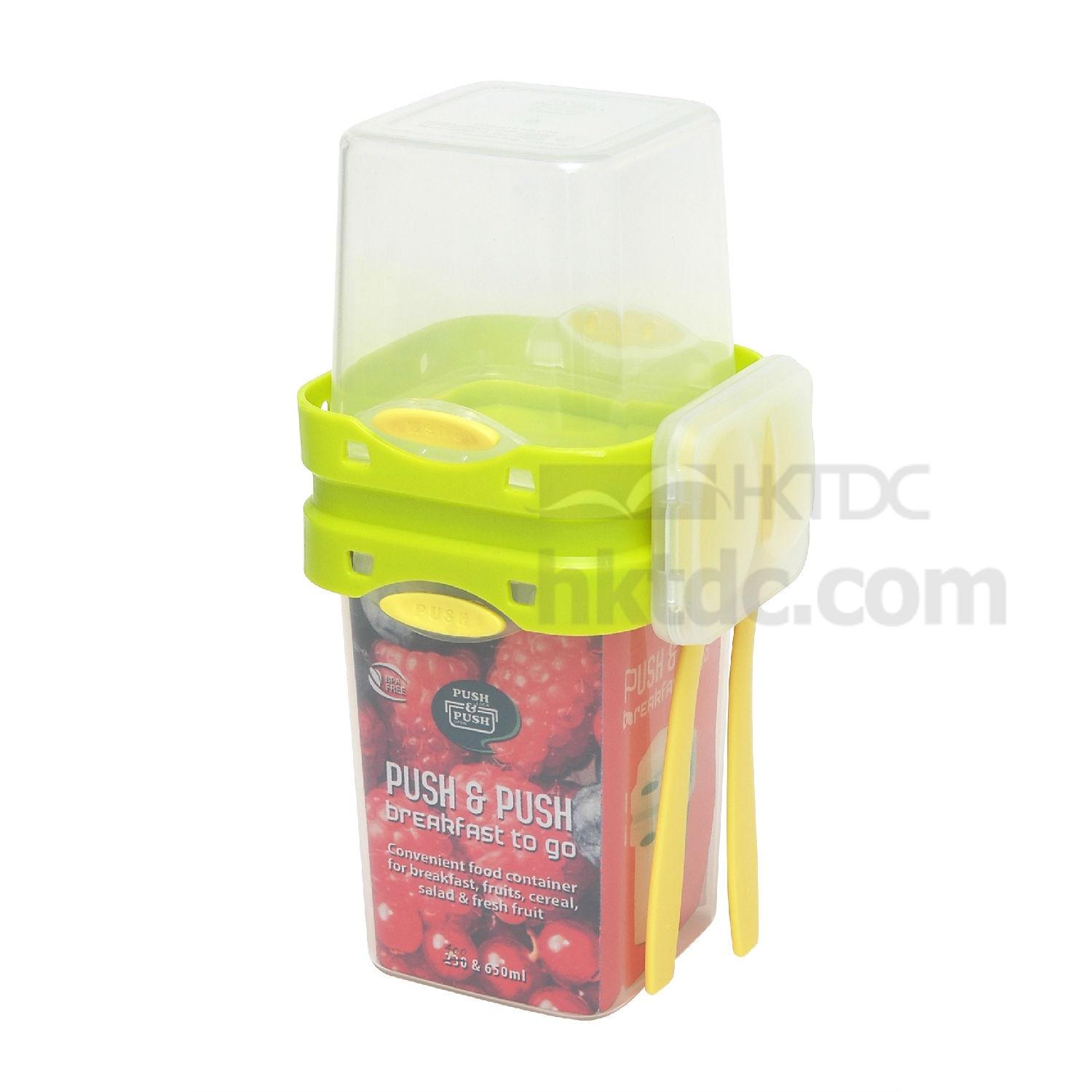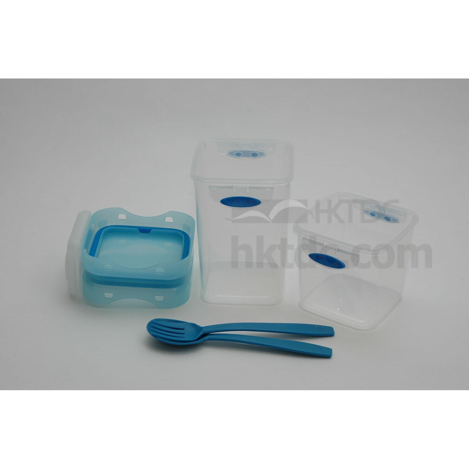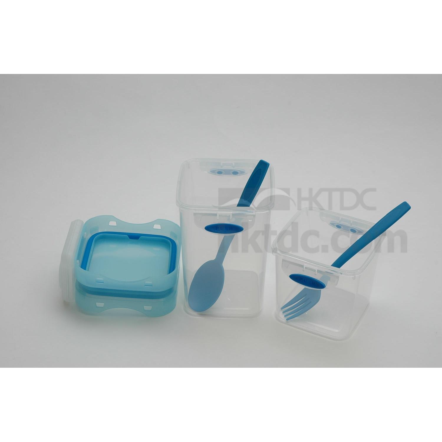 Featured here is a set of two food containers in interlocking design. The food containers have capacities of 400ml and 650ml respectively and come with a lid in the middle for covering. They provide secure spill-proof storage for food and come with a set of cutleries for added convenience.