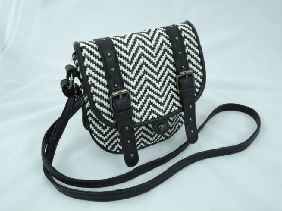 - Studs decor arrow PP straw with leather look PVC cross body bag.