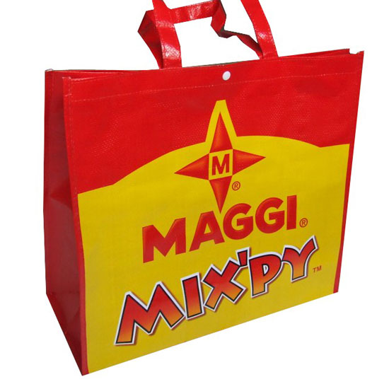 This is a woven bag made of high-quality PP material. It comes in bright red with orange accents. This bag comes with a large compartment for storing assorted items.