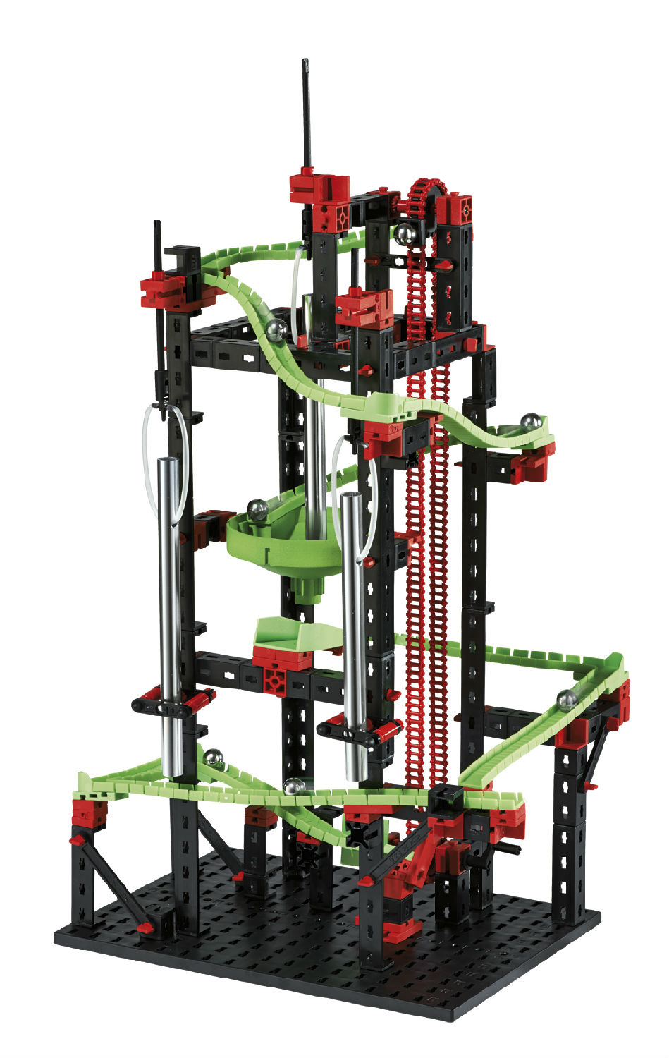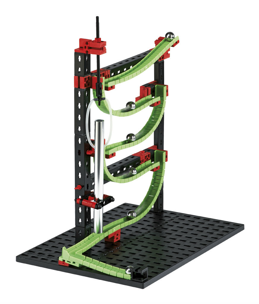 New action and sound parts open up many possibilities for even more exciting courses. While they race downwards, the steel balls let the new sound tubes create melodic tones. The rotary funnel offers a completely new way of bringing the balls onto the next rail. The balls also shoot and fly down the obstacle course through narrow 90° curves and a cross-over. On arriving at the bottom, the manual chain lift brings the balls back up to the top again. The new Dynamic M construction set is ideal for making four exciting obstacle courses. Incl. rotary funnel, 3x sound tubes, cross-over, 5x 90° curves, magnet holder, 8x balls, 4x flex-rails 90, 14x flex-rails 180. Ideal additions: Dynamic Tuning Set, Dynamic L, Dynamic XL, Rolling Action, Motor XS, Sound+Lights, LED Set. High Quality "Made in Germany".