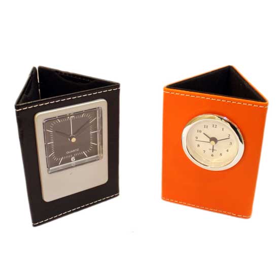 This PU desk clock features a compact, folding design. The elegant, miniature watch dial is embedded in the PU stand. This delicate, modern clock can be easily carried to different places with you.