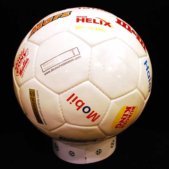 Pictured is a PU-made football designed for adults. Its plain white background is nicely trimmed with different brands in vibrant colors. The ball is also crafted with allover hexagons.