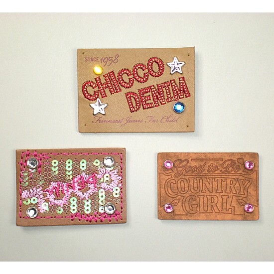 Displayed is a high quality PU label that is designed with durability in mind. This excellent label boasts a customizable print design. This fine label is adaptable as garment labels.
