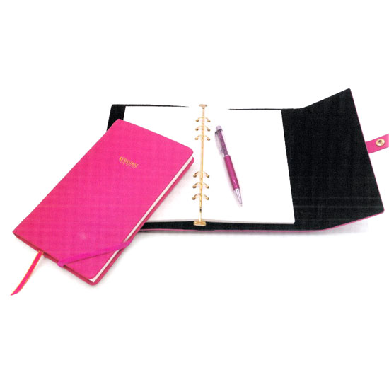 This notebook comes in a bright pink color. It features a ribbon bookmark and elastic band for your convenient use. An organizer with the same design is also available for your selection.