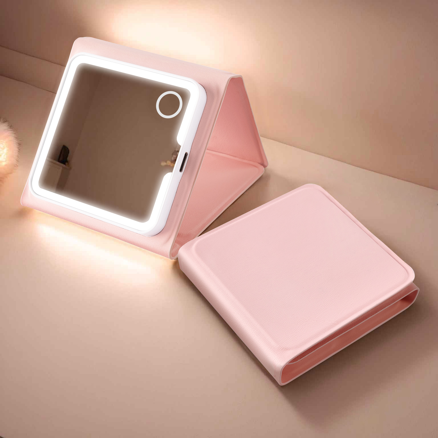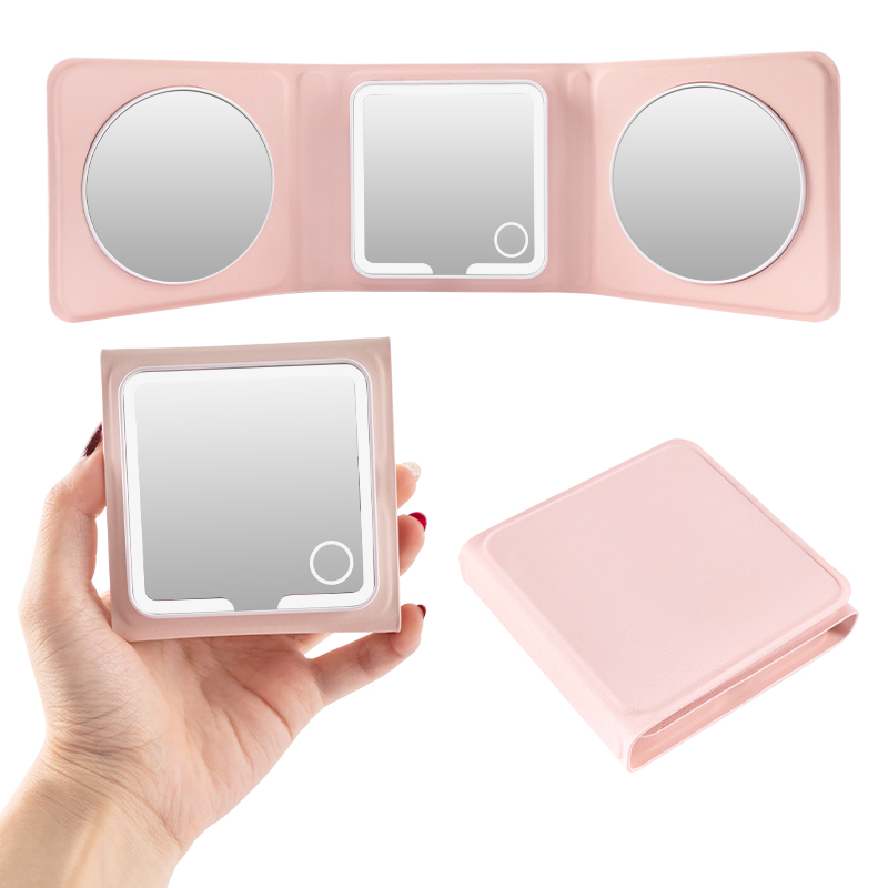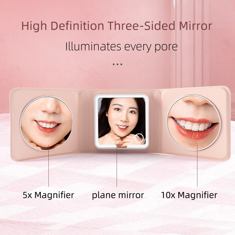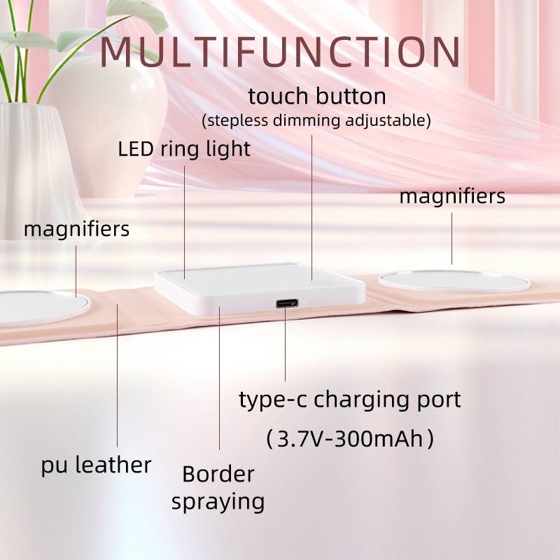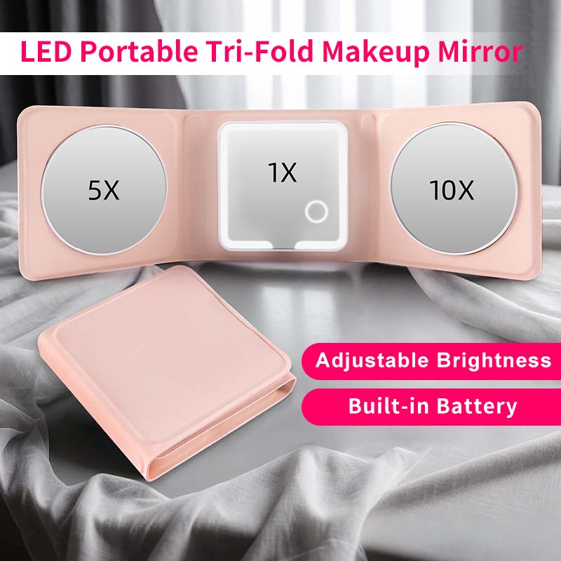 Portable Folding: Tri-fold design, palm-sized, fits easily in your bag LED Lighting: Built-in ring light for clear makeup application in dim environments PU Leather: Premium texture, scratch-resistant, durable, and comfortable grip Multi-Magnification: 10X/5X zoom for detailed, flawless makeup from every angle USB Rechargeable: Long-lasting battery, your essential beauty companion for travel and business trips.