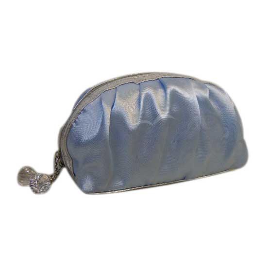 This PVC cosmetic bag features an unfixed dome shape. The glossy surface comes in a pale blue complexion with grayish edges. The zippered closure makes sure the cosmetic items will not pour out when the bag is thrown upside down.