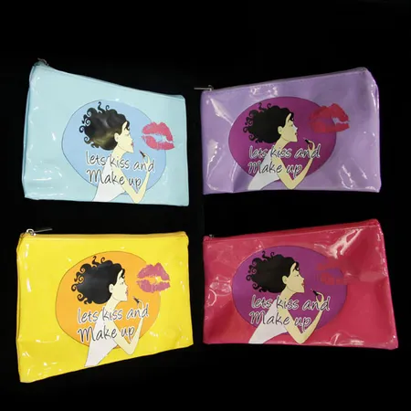 Shown here is a series of cosmetic bags designed in a slim compact shape. The bags come with PVC leather shells in a sharp glossy color. Color prints are added on the front to look exceptionally fashionable.
