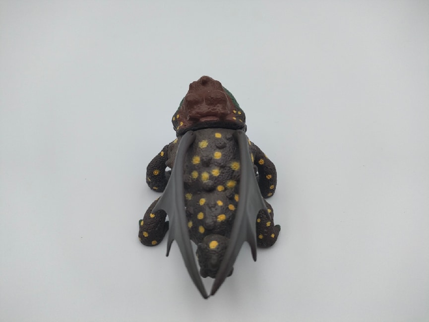 When viewed from the front, it somewhat resembles a frog, while from the back, it looks a bit like a ladybug and a small crocodile.