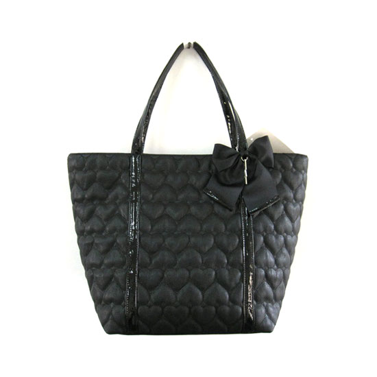 This is a handbag with an elegant and fashionable design. It features a large compartment for storing assorted items. The bag comes with embossed heart patterns and is also adorned with a dainty bow.