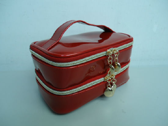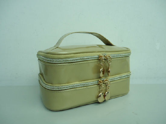 Patent PVC two compartment cosmetic bag.