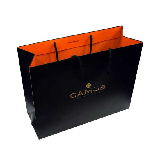 This paper packaging bag features an elegant design. It comes with a black surface with text in an attractive color. The bag is finely manufactured for extended durability.