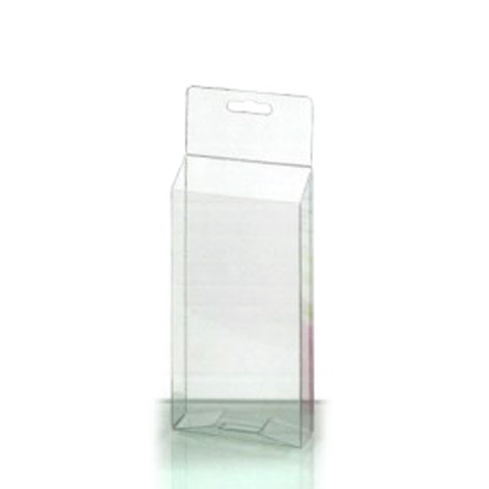 This packaging box comes in a rectangular shape. It features a transparent design to allow customers to see the products inside clearly. It is produced with a hanging loop on top for convenient hanging.