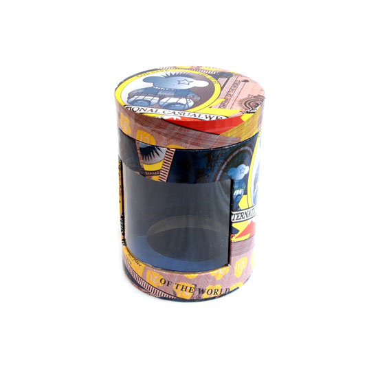 This is a packaging box in a cylindrical shape with a display window. It is printed with allover comic images in bright colors for enhanced uniqueness. This box is great for packaging assorted items.
