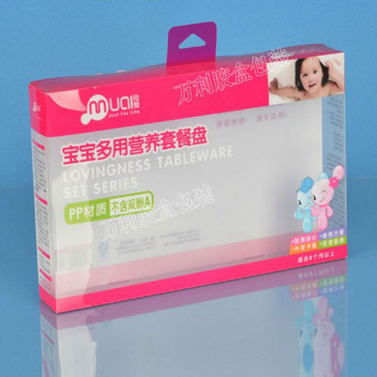 This packaging box comes with a transparent design. It is specifically designed for packaging tableware sets. The cartoon figures add an adorable touch to the whole piece.
