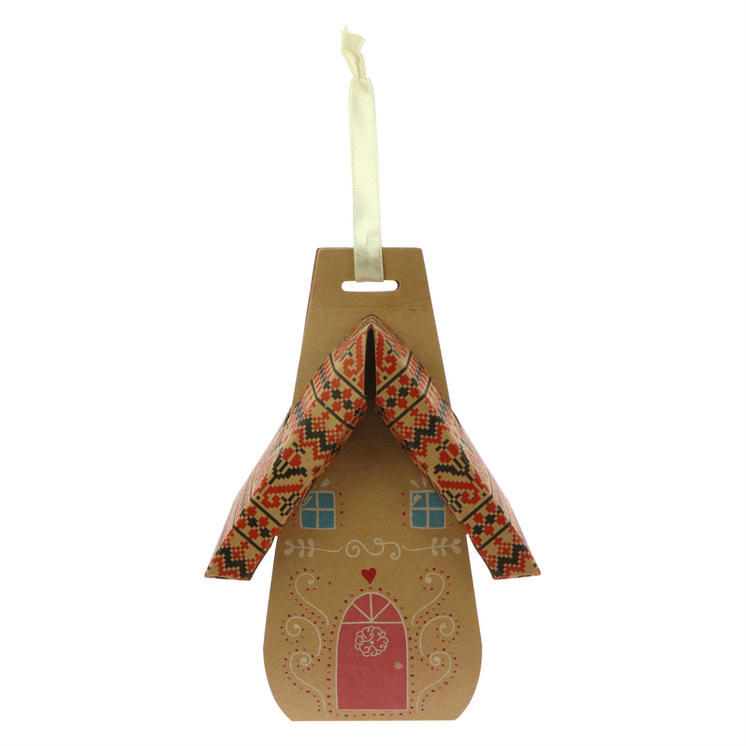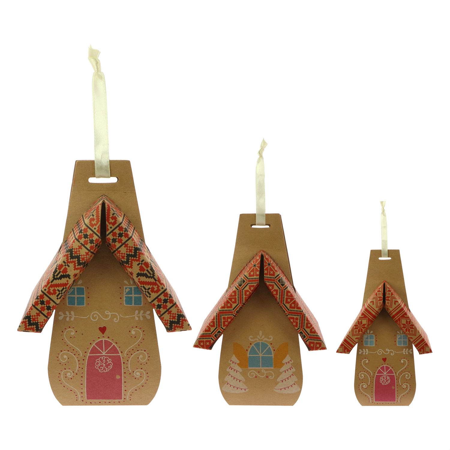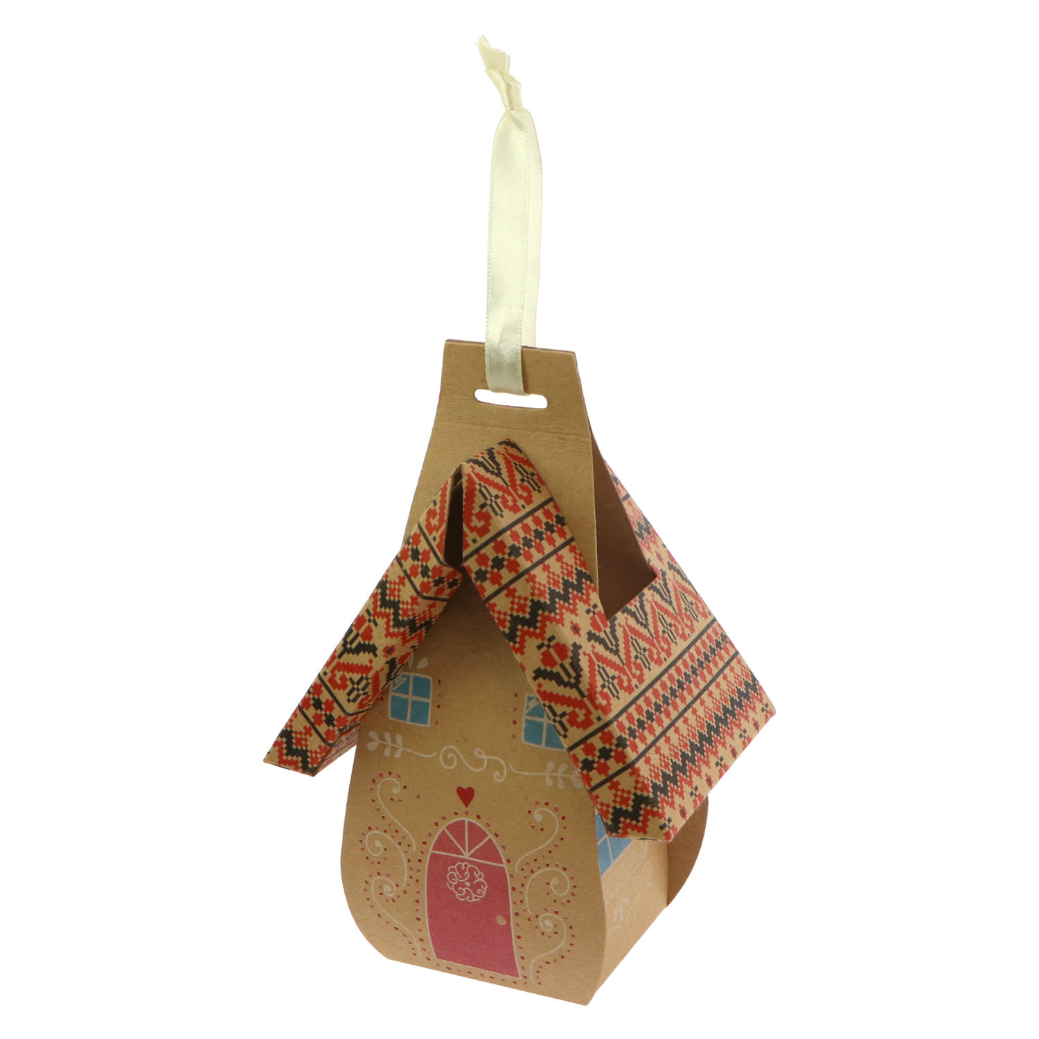 This packaging box is made of paper and comes in the design of a house. It has a ribbon handle on top for hanging or carrying and is excellent as an ornament for the Christmas tree. The packaging box offers a lovely gift packaging solution for the holiday season and is available in three different sizes.