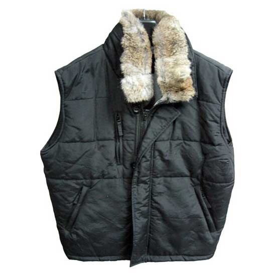 This stylish padded vest features a black nylon taslon exterior. The vest is designed with fur trimming on the collar for added warmth. The front zipper closure and two side entry-pockets finish the design of this vest.