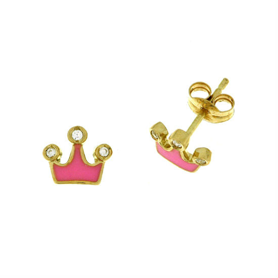 Pair Yellow Gold enamel crown earrings. With CZ or Diamond.