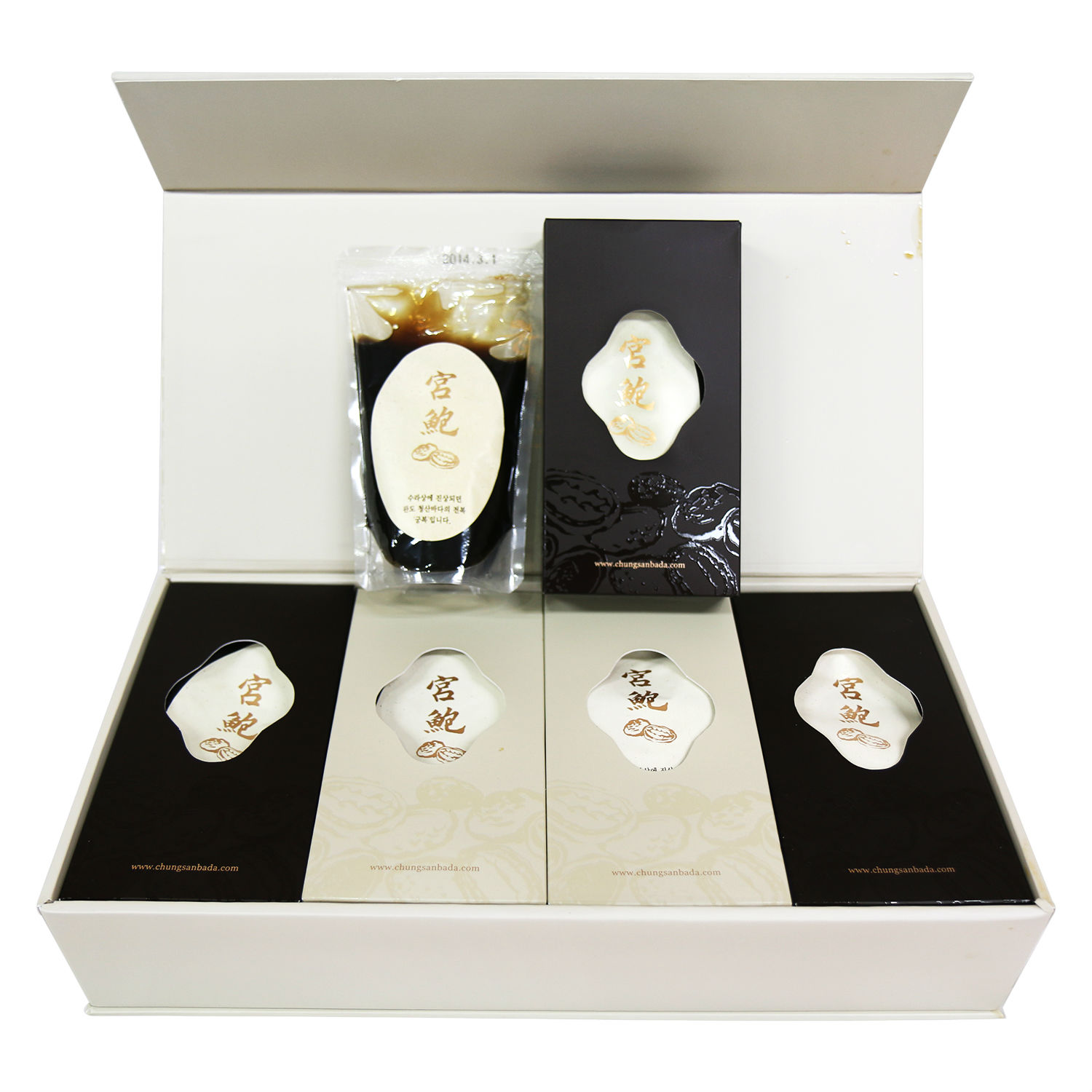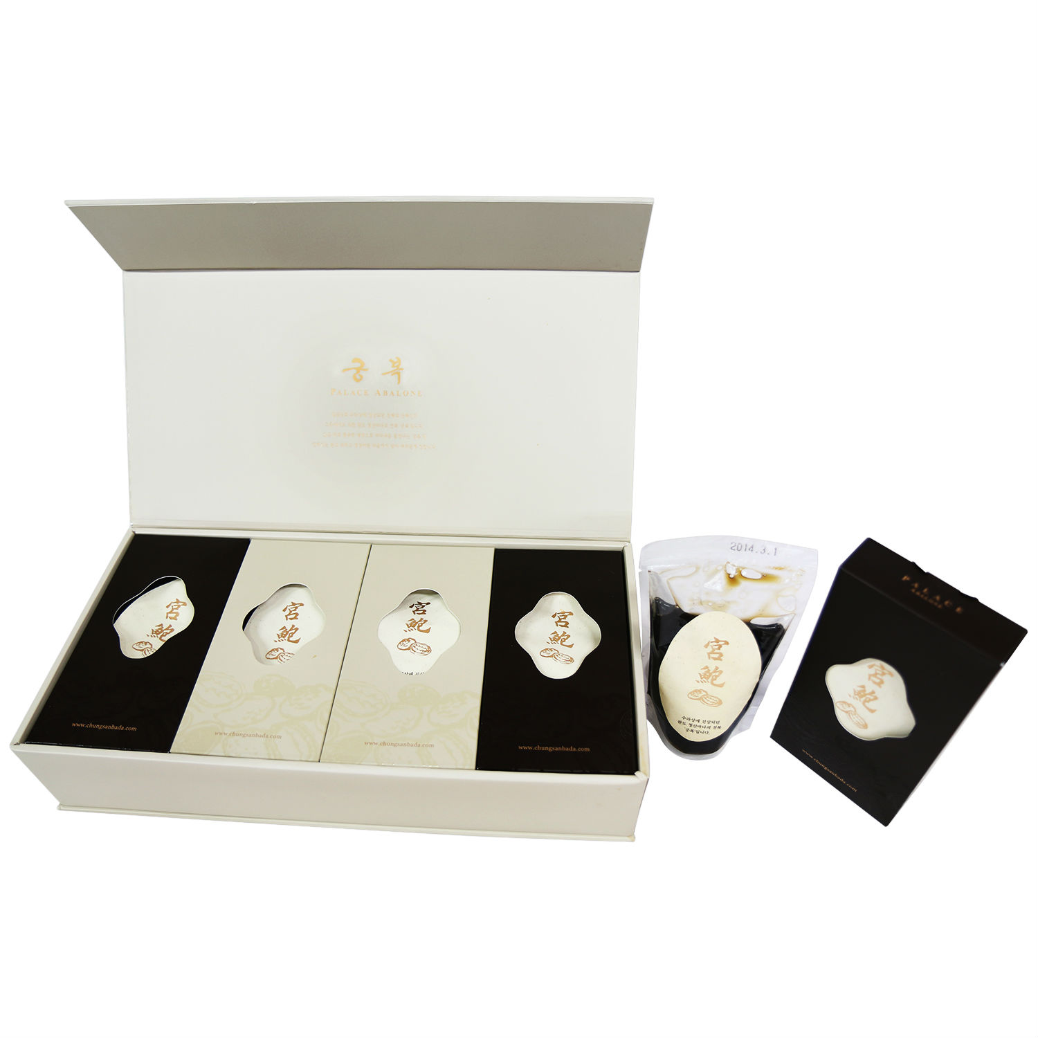 Get a taste of this luxurious palace abalone. The Korean name of the product is "Gung Bok", meaning this abalone is exclusively served for the palace. Each box comes with 4 pouches of abalone. Fancy and exquisite, this palace abalone makes a perfect gift set for gourmets.