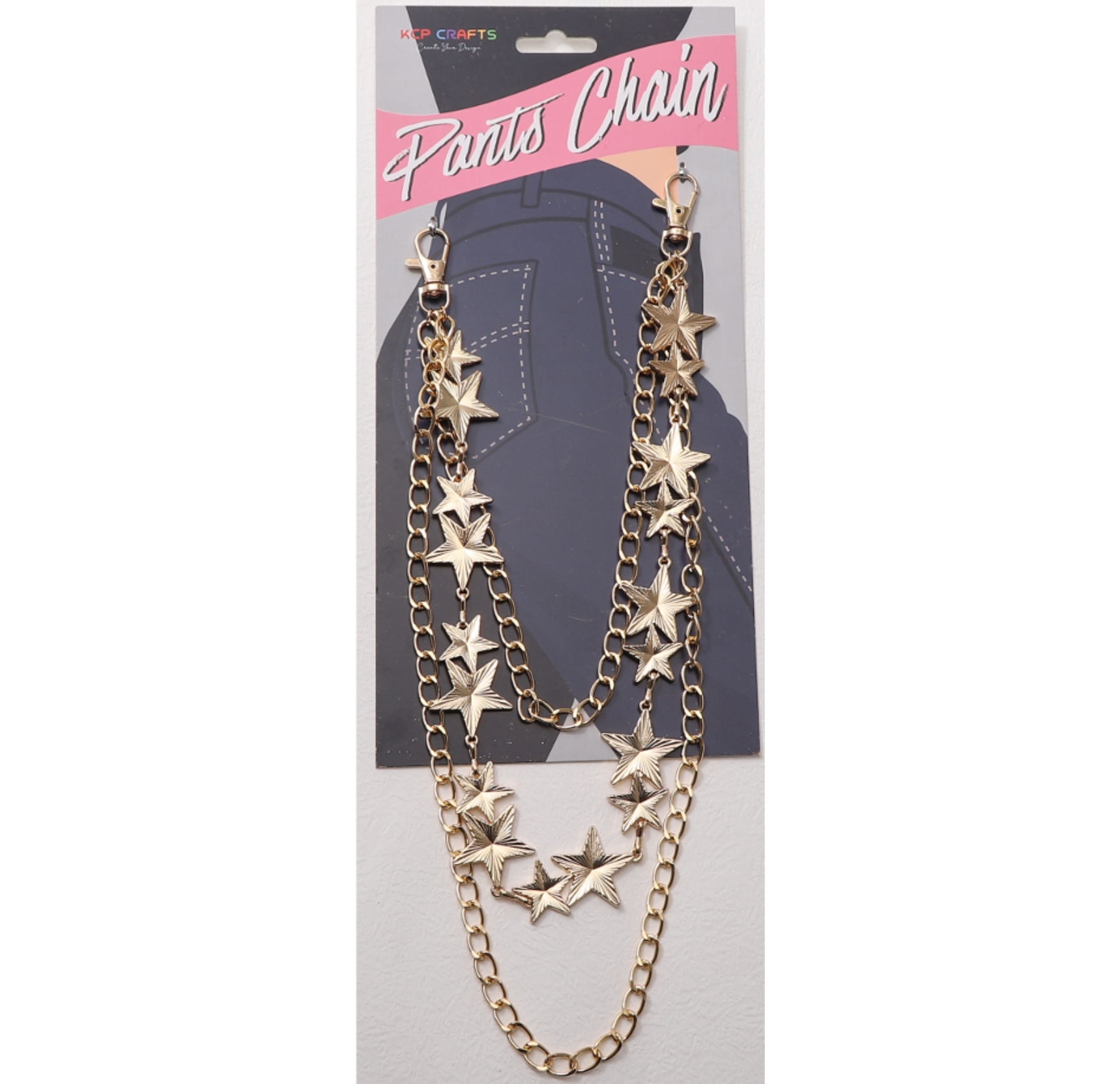 This multi-layer star pants chain features a vintage gold finish and star charms. It’s perfect for decorating jeans, jackets, or bags, adding a bold, rebellious touch to your look.