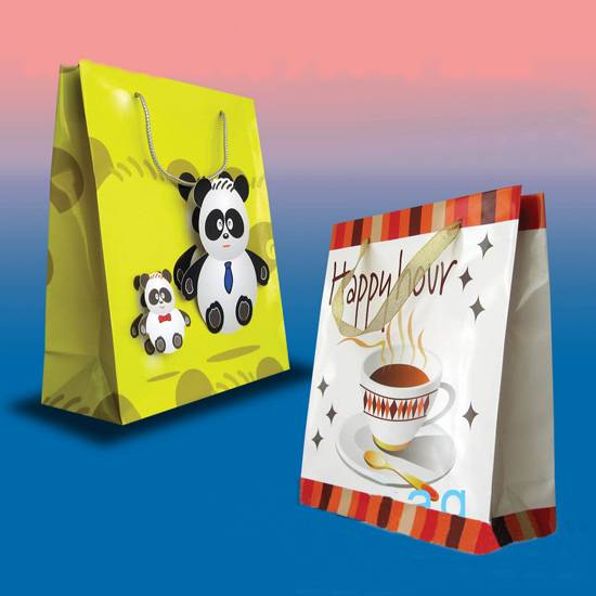 These are two paper bags which are handmade. The left one features two pandas on a yellow background. The right one has ribbon handles and features a cup of coffee on a white background.
