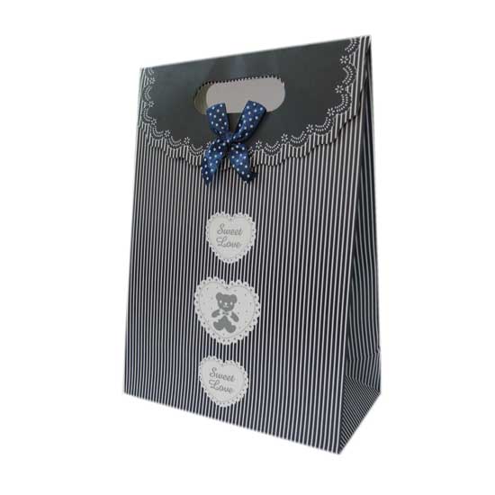 The paper bag features an elegant striped appearance. It is designed with a corrugated closure flap. This bag is also embellished by a blue dotted bow.