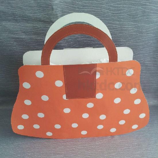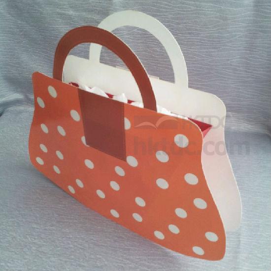 The paper bag features a fashion handbag design. It is made out of 350g white card paper. The bag also exhibits a nice dotted design.