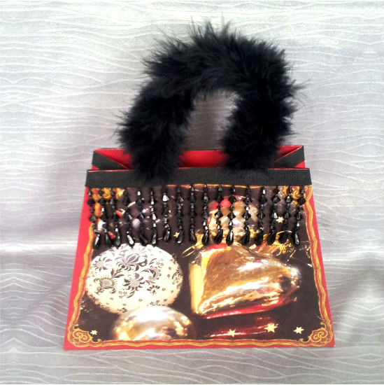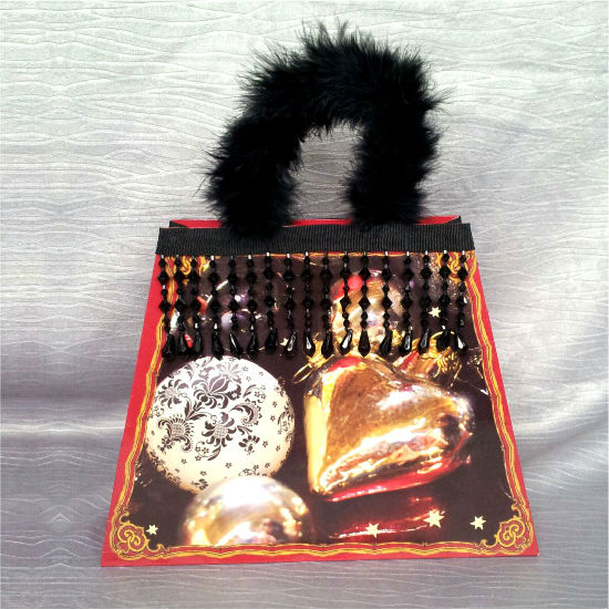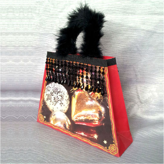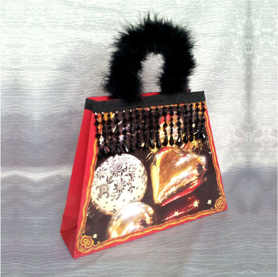 The paper bag is trimmed with black fur for style. It is done with quality printing in precise colors. The folding design also allows easy storage and reuse.