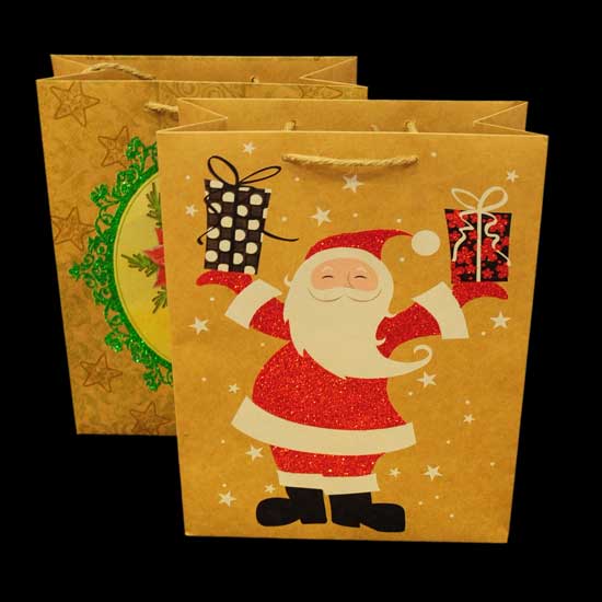 This mustard yellow paper bag features a Santa Claus holding presents on his hands, exuding festive vibes. His costume is skillfully adorned with red glitter for extra glamor. Made of Kraft paper, this rectangular paper bag bestows durable construction.