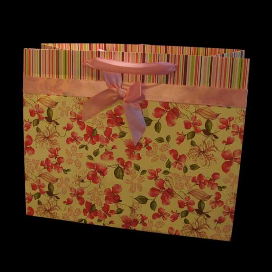 This rectangular paper bag flaunts an alluring floral print for a feminine touch. The upper edge is adorned with colorful stripes and a pink bow for extra glamor. The gorgeous bag is finished with a pair of pink ribbons for carrying.