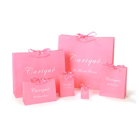 This rectangular paper bag comes in captivating pink, which is win over the favor of ladies. The front is designed with elegant lettering in bright white for a contrasting effect. The attractive shopping bag is finished with a pink ribbon for an extra feminine touch.