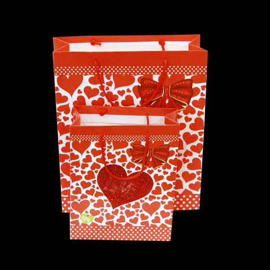 This paper bag is accented with allover sweetheart-shaped patterns for a sense of attractiveness. The two durable handles at top allow ease of carrying. This two-toned design in white and red gives it an exotic touch.