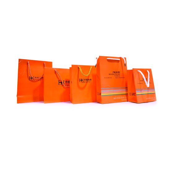 This paper packaging bag is designed in bright orange for an eye-catching look. It comes with Chinese word logos for an elegant touch. There are various sizes and designs available for you to choose from.