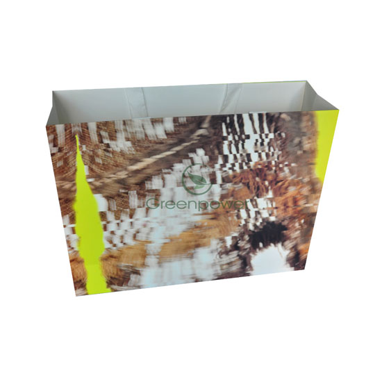 Displayed is a paper bag printed with artistic patterns. It is used to hold shopping items or gifts. It is made from high quality paper for long lasting and repeated use.