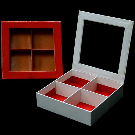 Featured here is a squared paper box with four compartments. The PVC window allows a glimpse of the content. This rigid paper box offers an awesome gift packaging solution.