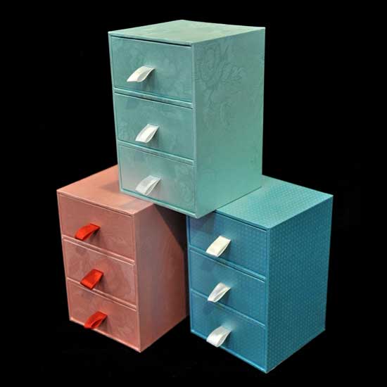 Presented here is a 3-tier box that comes with 3 drawers. Each drawer features a silk ribbon puller for easy use. Store your small accessories in an organized way with this 3-tier paper box.