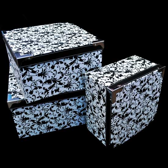 The paper boxes here come in a nice rectangular shape. They are covered with black-and-white patterned paper. The covering paper imitates the texture of leather and is embellished with stitching patterns.