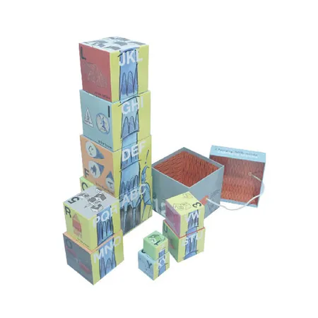 This is a set of toy blocks in assorted shapes. Each piece is printed with colorful patterns and English letters. This set of building blocks is a great preschool toy for little children.