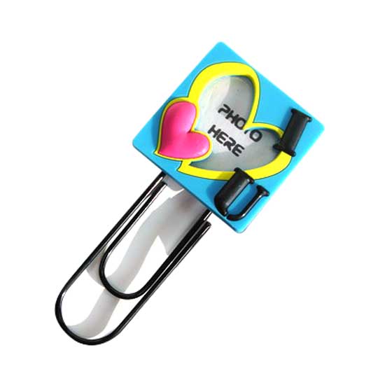 This is a paper clip featuring a mini photo frame for decoration. The mini frame is made of PVC in wonderful colors. The heart-shape frame makes this paper clip a heartwarming one for desktop use.