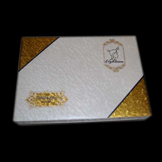 Displayed here is a gift box made of MDF. It boasts a paper-covered design in white and golden colors. This paper-covered MDF box is a great choice for gift packaging.