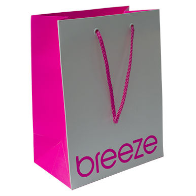 Outlined is a gift bag with two colors. The string handle and sides come in neon pink. The grey front contrasts well with the logo in shocking pink. Enhance your store image and draw attention to your business name with this printed paper bag.