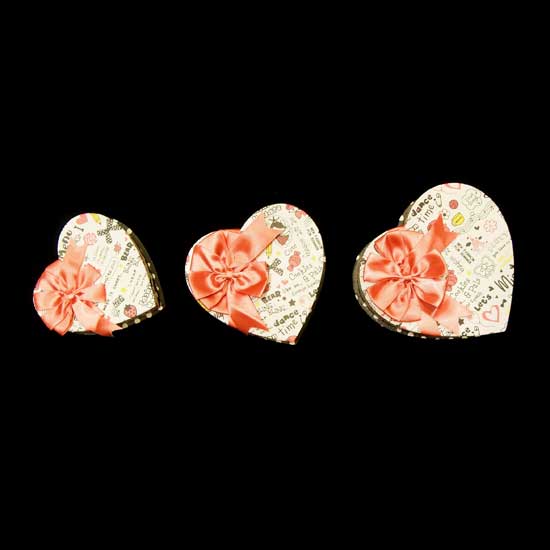 Shown here are three paper gift boxes coming with different sizes. They feature a heart shape design with a bow decoration ornamented on the cover for an added style. These delicate paper boxes are ideal for gift packaging.