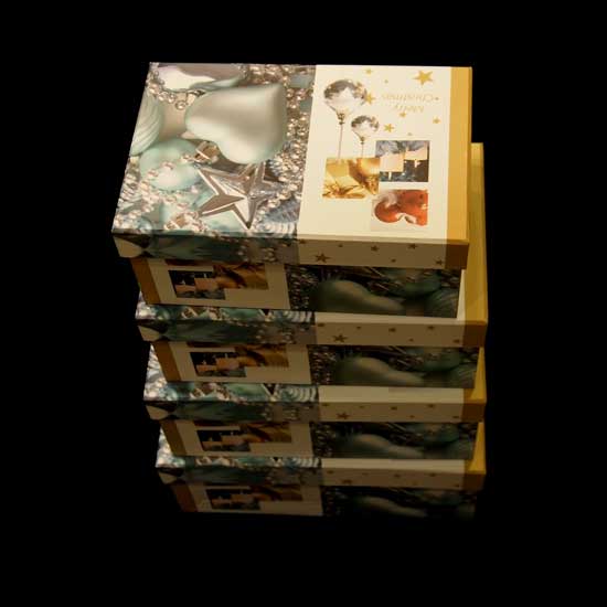 Displayed here is a set of paper gift boxes coming with a rectangular shape. Beautiful patterns of heart shapes, balls and stars add extra glamor to the boxes. These sturdy paper boxes make a stylish complement to your gifts.